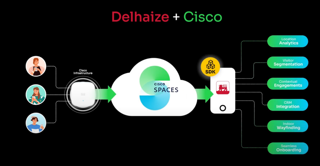 - Delivering Contextual Push Notifications: Lastly, Delhaize needed a way to connect and engage with customers while in store. To do this, they deployed loyalty app push notifications initiated by presence and location context from Cisco Spaces and thereby influencing in-store purchasing behavior via contextual engagements, based on customer location within the store, as well as previous purchases and preferences.