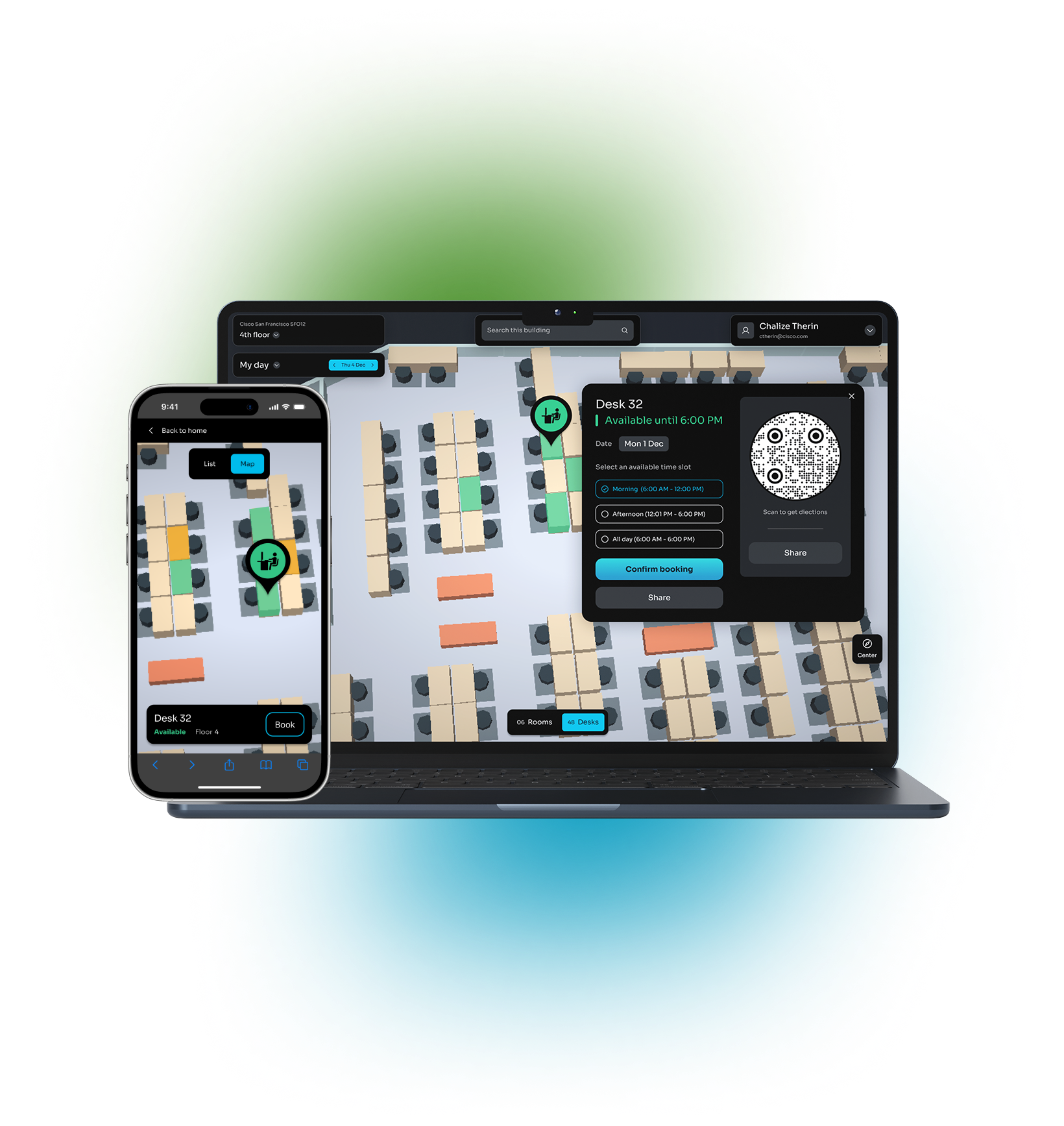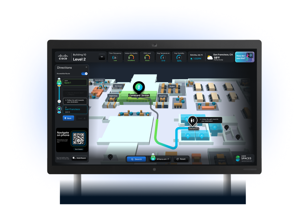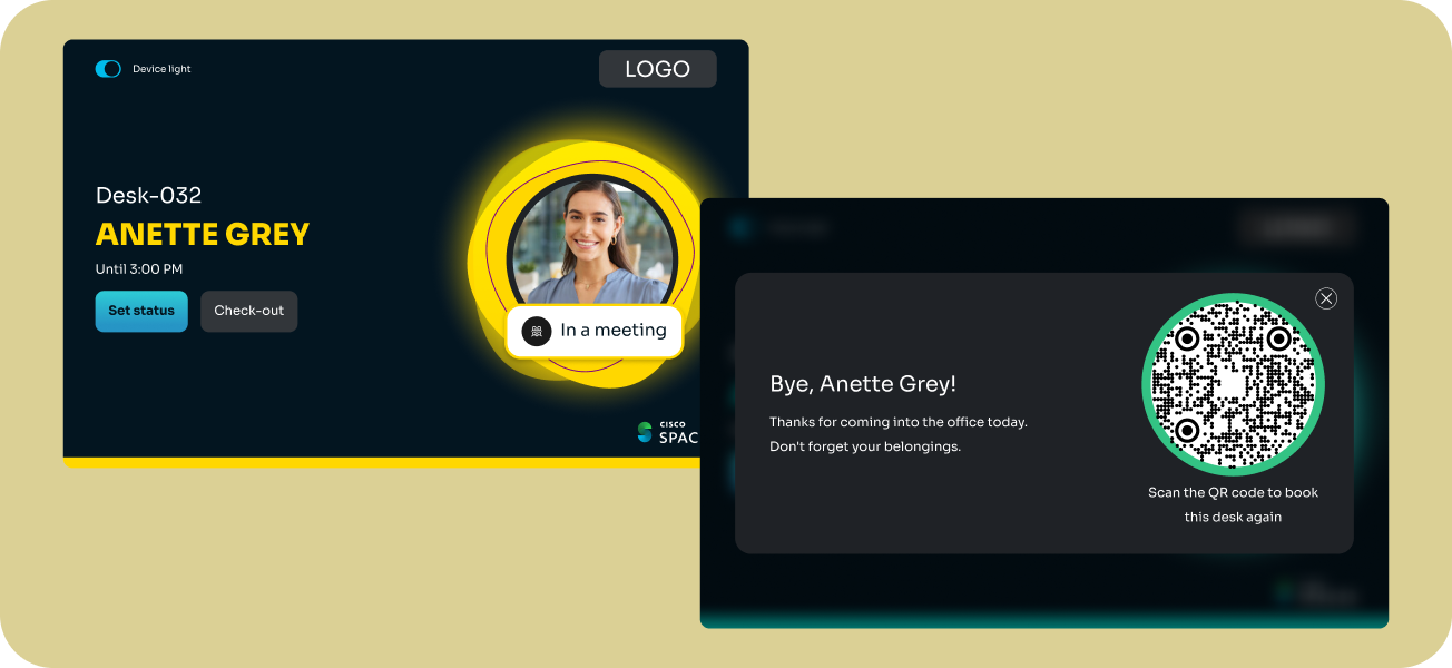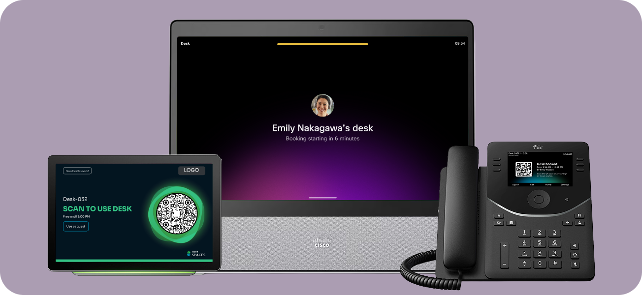 Drive higher reservation follow-through with check-ins. When employees arrive at their desks, their Cisco Navigator, Desk Series, or Phone Series device is ready with their name, profile photo, and a QR code. A quick scan verifies the reservation and gets them settled instantly. Facilities and Real Estate teams gain accurate, real-time visibility into true desk occupancy, eliminating guesswork and driving smarter space utilization.