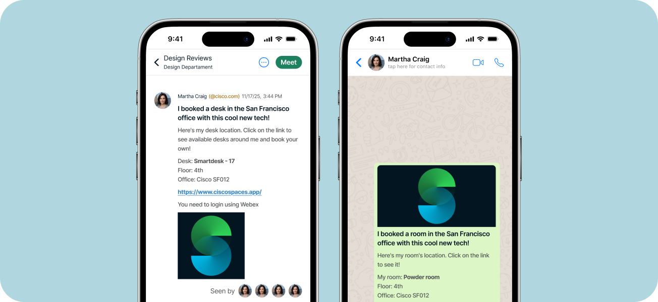 Reserve your favourite desk even before you arrive at the office! Smart Desking uses the Space Explorer web app to allow employees to find, reserve and check in to a bookable desk in advance, from the comfort of home, or anywhere, really. By checking in using a Cisco Navigator, Desk Series, or Phone Series device, employees can also share their location with colleagues.